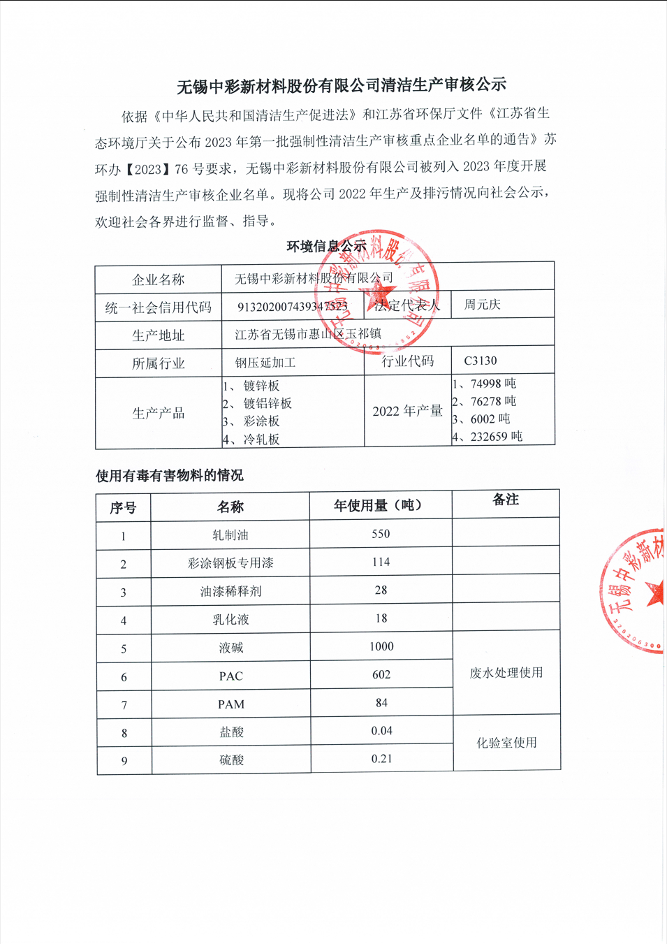 无锡中彩新资料股分无限公司洁净出产考核公示